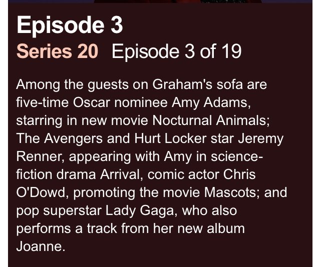 ghs 3,343 Posted October 7, 2016 Share Posted October 7, 2016 Here is the link for the offical schedule of the show: http://www.bbc.co.uk/programmes/b07zj35w Gaga's still listed as the performer. Maybe Niall is a late add on...hopefully this doesn't mean that Gaga will only perform one track Link to post Share on other sites More sharing options...