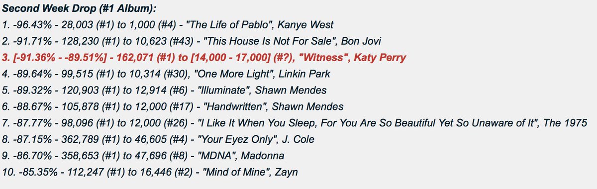 freebit 6,240 Posted June 21, 2017 Share Posted June 21, 2017 1 hour ago, ZiggyZiggs said: Shawn actually has the biggest 2nd week sales drop with 89% then comes MDNA BTW YEEZUS @Skai Jackson Wait....I just checked again and The Life of Pablo holds the record of 95% second week drop, so King still keeps his record! (link: http://thatgrapejuice.net/2016/04/chart-check-billboard-200-kanye-wests-pablo-suffers-95-sales-drop-2nd-week/) It remains to be seen if Katy can top that. Link to post Share on other sites More sharing options...