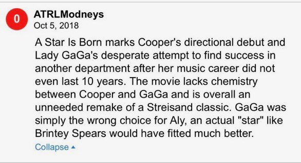 TeenIdle 126,745 Posted October 5, 2018 Share Posted October 5, 2018 2 minutes ago, Monsterious said: the metacritic page for ASIB OST is under attack by britney fans, giving 0/10 to the soundtrack https://www.metacritic.com/music/a-star-is-born-original-motion-picture-soundtrack/lady-gaga Britney would've stayed the live singing so hard, maybe almost identical to the soundtrack. Oh, wait.. 𝖓𝖊𝖜 𝖗𝖊𝖑𝖎𝖌𝖎𝖔𝖓 Link to post Share on other sites More sharing options...