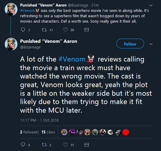 Galagala 4,618 Posted October 2, 2018 Share Posted October 2, 2018 Following the news that "Tom Hardy says all of his favorite parts of Venom got cut out of the movie", here comes the first reactions of "Venom." The official reviews from film critics will arrive in hours. Confirmed: Mother Monster will beat a Marvel Monster! (Hey, but I just found out there are lots of fake(repeated) reviews coming from different accounts........Some people thought they are ASIB fans trying to attacking Venom. Let's prevent ourselves from doing that kind of disgraceful thing!) https://twitter.com/LightsCameraPod/status/1046994277891543041 @Tom_Jorgensen "Sorry to say that #Venom is pretty much a complete failure - a tonal mess that feels 15 years old, ignoring the storytelling strides that the superhero genre has made in recent years. A few fun Venom-centric moments aside, it has nearly nothing to offer. Don't get your hopes up." @PNemiroff "Significant chunks of #Venom don’t work *at all* but there is some serious charm to the Eddie/Venom relationship. Not sure I had the intended reactions to some scenes but fun is fun - even when it’s totally ridiculous, right? It’s too bad they didn’t go for the R rating though." @treadtalks "Now that impressions can be shared: #Venom is pretty much this year’s Fant4stic. Everyone except for Hardy is coasting through their performance... I would hate to have to do press for this movie. #Venom #TomHardy" @DanielRPK "Venom is Catwoman level bad, with Tom Hardy's worst performance since This Means War. DON'T SEE THE MOVIE!" @rustypolished "Social embargo for #Venom is up. I talk about this a lot in my review but this is a movie that somehow slipped through a wormhole from 2004. That's my biggest take. It's a movie that spilled from the pre-MCU era through a crack in time and space.It's...not a complete disaster? At least I was never mad watching it? But it is an excruciatingly surreal experience. The humor, the story beats, everything right down to the Eminem theme song feels like it emerged Kimmy Schmidt style from a sealed off early 00s bunker.Think Affleck Daredevil. Think Ang Lee Hulk. Think Halle Berry Catwoman. That's...I mean, that's really all there is to be said, I think. It's absolutely bizarre." @bverhoev "Venom wasn’t as bad as everyone was saying it was going to be. Tom Hardy is and always will be a great actor, and I laughed a lot — but I’m not sure whether that was intentional or not. Post-credit scene is." @Hectorisfunny "Venom was surprisingly funny! I had a freaking great time watching it. Despite some problems, it did right by its main character, Eddie Brock/Venom. People forget that he's always had a weird sense of humor in the comics, and that humor is fully on display in the movie!" @BrandonDavisBD "Action-sequences and Eddie and Venom's odd relationship are the highlights of #Venom but if Sony wants to move forward with a universe, it needs to just keep the few parts that work and scrap the large portion which does" Link to post Share on other sites More sharing options...