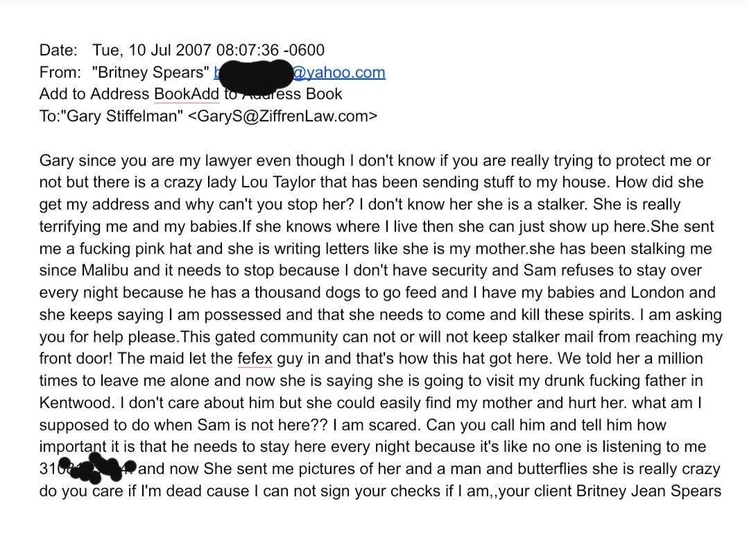 Gimme More 35,421 Posted August 16, 2020 Share Posted August 16, 2020 EndTheConservatorship is trending on Twitter. Britney's hearing is on August 19th. Lou tried to get Lindsay Lohan into a conservatorship - Lindsay's parents have since bashed Lou (Lindsay has also been liking MANY FreeBritney posts) Lou is the woman Britney accused of stalking her in 2007 - please see the emails below. Check out this Twitter thread: Go through the Twitter thread for more details! FREE BRITNEY. Link to post Share on other sites More sharing options...