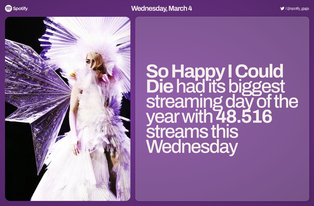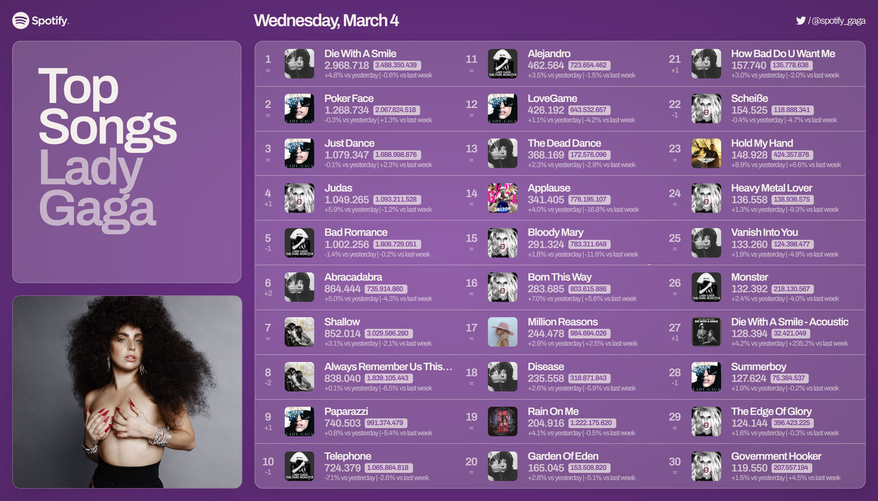 Gaby15 14,482 Posted 8 minutes ago Share Posted 8 minutes ago Spotify monthly listeners: 1 Bruno Mars 131,097,532 (+391,535) 2 Bad Bunny 123,934,765 (+47,725) *4 all-time Lady Gaga 124,637,761 (gap 702,996)* 7 Lady Gaga 96,439,886 (-149,311) Link to post Share on other sites More sharing options...