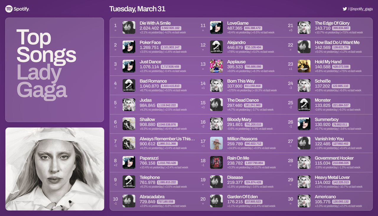 LadyxGaGa 3,006 Posted 5 hours ago Share Posted 5 hours ago On 4/2/2026 at 9:36 AM, ManMan said: APR 1 DWAS 33(+3) 2,708,177 (+91,544) PF 199 (-10) 1,225,457 (-42,359) _____________________________________________________________________________ BOAF 39(-1) 2,543,939 idk how likely but i rly rly hope BOAF hits the top 20 again i rly hope her concert movie like gives HMHAS a huge boost that would be amazing !!! Link to post Share on other sites More sharing options...