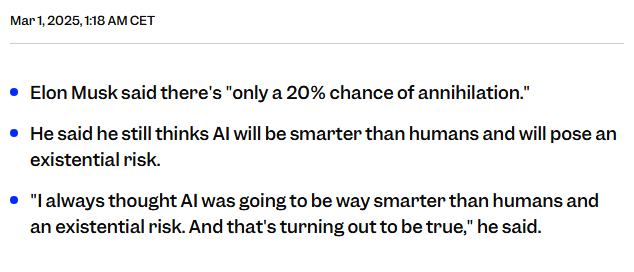 lastpopicon 37,224 Posted 8 hours ago Share Posted 8 hours ago (edited) 5 minutes ago, Teletubby said: Not long ago, this self-replicating artist replicated by AI was telling people to make music using her AI generated voice, formed an AI Girl Group, was posting ai generated art, created AI-powered stuffed toy for kids, sold AI artwork at auction, got the AI Impact Award in Dubai where she stated that AI is magic and that we focus too much on the negative aspects ... now her stance on AI is the same as Musk's Not sure what you're trying to say but Musk must not be happy, she used chatgpt as sponsor and not grok Edited 8 hours ago by lastpopicon The melody that you choose can rescue you Quote Link to post Share on other sites More sharing options...