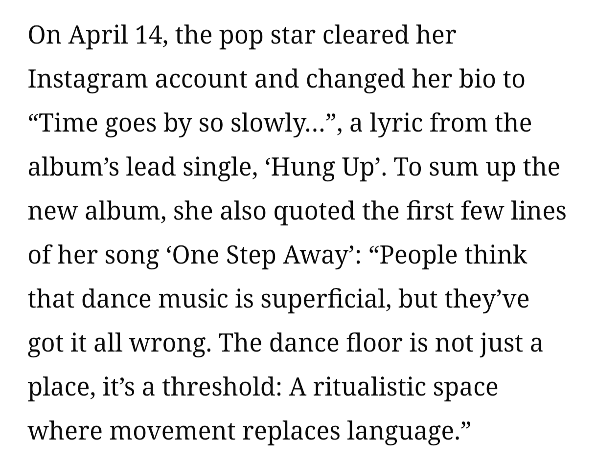 elijahfan 27,187 Posted 6 hours ago Share Posted 6 hours ago (edited) This really is tailor made for the clubs. It obviously isn't the most lyrically fleshed out songs, but it does have the message simplicity of classic disco hits of the 70s. In that sense, it's very much in the spirit of the first Confessions. This is a deliberate reheating of nachos, I'm hearing a lot of classic Madonna sonic staples from across the board (Justify My Love, Future Lovers and Ciao Bella especially), I'd say it's more of a vibe setter. Not necessarily the bang we could expect if we keep in mind Hung Up opened the original era, but I'm confident she and Stuart Price know what they're doing. I feel like this is just a hype track to slowly kickstart things and that the actual lead single will be released next week. Edited 6 hours ago by elijahfan 2 Quote Link to post Share on other sites More sharing options...